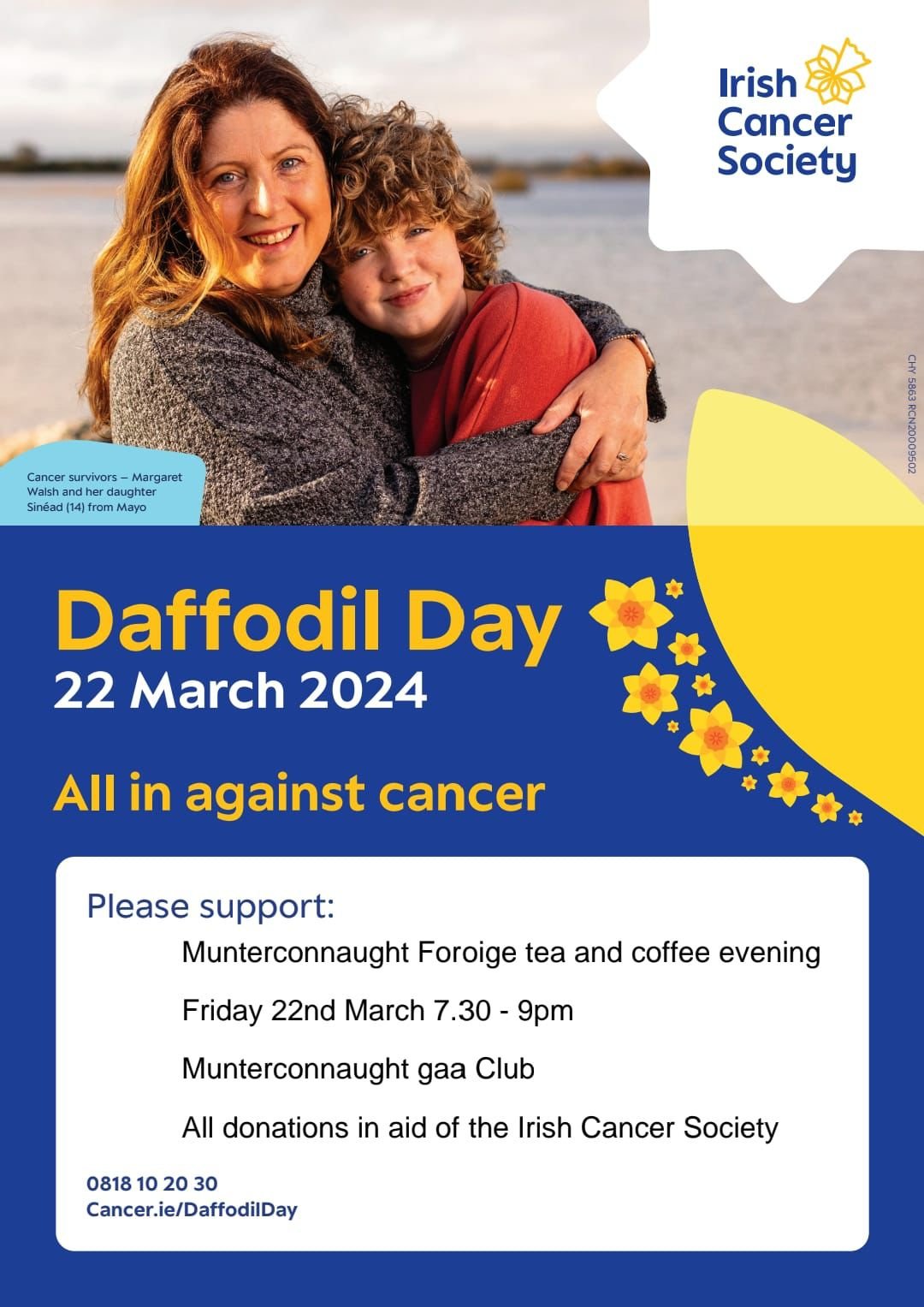 Munterconnaught Foroige club are hosting a tea coffee evening Friday 22nd March daffodil day in aid of the Irish Cancer Society. 22 Mar Written By Tomas Lynch Tomas Lynch
